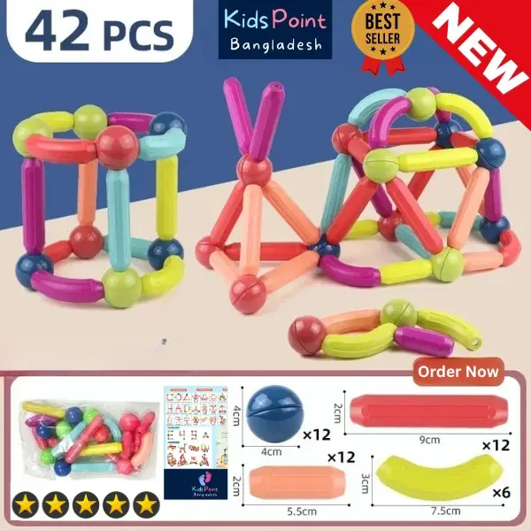 এই Magnetic Blocks Building Toy Set শিশুদের শেখা ও খেলার জন্য একটি আদর্শ Educational STEM Toy। রঙিন ম্যাগনেটিক রড ও বলের মাধ্যমে শিশুরা ঘর, টাওয়ার, ব্রিজ এবং বিভিন্ন 2D ও 3D জ্যামিতিক স্ট্রাকচার তৈরি করতে পারে।